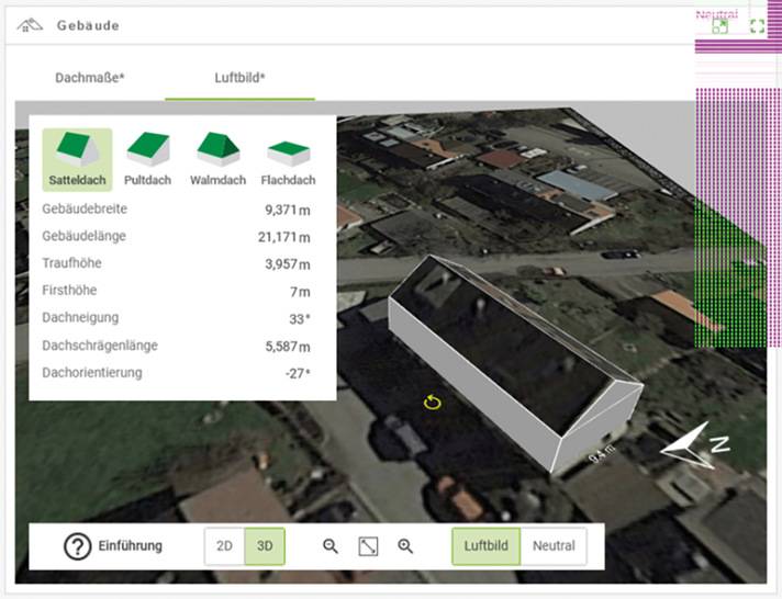 Nach Eingabe der Adresse kann das Gebäude, auf dem die Anlage geplant wird, direkt von einem Satellitenfoto aus Google Maps abgezeichnet werden. Standort, Gebäude- und Dachmaße werden dabei automatisch übernommen. Die Google-Maps-Funktion bedeutet darüber hinaus Verbesserungen an der Bedienungsoberfläche.