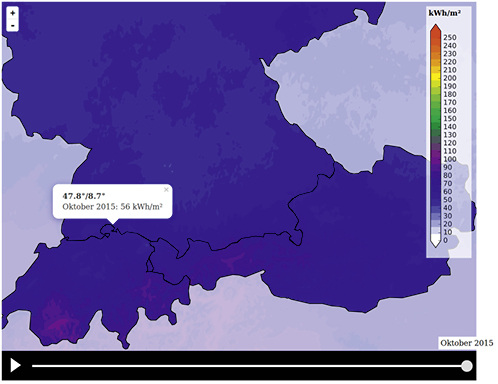 Seit einem Jahr präsentieren wir im gedruckten Heft und online den Einstrahlungsatlas für Deutschland, Österreich, Schweiz. Die Karte bildet jeweils die tatsächliche Sonneneinstrahlung eines Monats für die genannten Regionen ab. Ab sofort ist dieser Service für Sie noch attraktiver. Nach dem Log-in als Abonnent können Sie in einer interaktiven Karte einen konkreten Standort anklicken und die genauen Monatswerte des Vormonats abrufen. Über einen Play-Button ist auch eine Vergangenheitsbetrachtung möglich. Mit einer Zoomfunktion können Sie den Kartenmaßstab verändern.