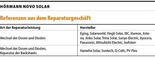 Manchmal sind es Fehler in der Fertigung, manchmal falsche Handhabung, Installationsfehler oder einfach nur Pech: wenn faustgroßer Hagel auf die Module knallt oder der Blitz in die Strings rauscht. „Langsam entwickelt sich ein kontinuierliches Geschäft mit der Wartung und der Reparatur von Photovoltaikanlagen“, sagt Patrick Müller, Geschäftsführer von Novo Solar in Laubusch in der Lausitz. „Wir bauen beschädigte oder fehlerhafte Module nach, deren Hersteller mittlerweile vom Markt verschwunden sind.“