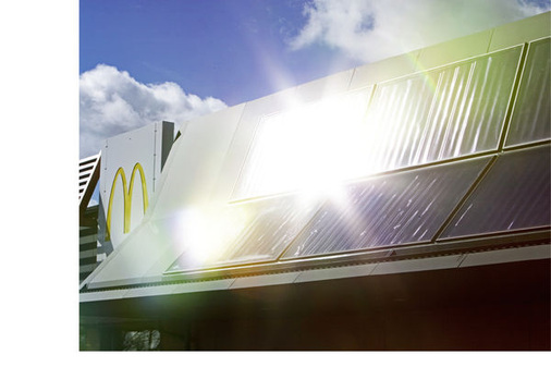 Dafür kann man in Deutschland gut 60 Kilometer Auto fahren. Die installierten PV-Module auf dem angedeuteten Scheunendach von McDonald’s haben da eher symbolischen Charakter. Zehn hinter Glas verbaute Dünnschichtmodule aus amorphem Silizium mit einer gekoppelten Höchstleistung von 1,14 Kilowatt lassen an einem Tag 3,4 kWh erwarten. Das entspricht 1,7 Kilo CO 2 und damit einem halben Hamburger. Wie McDonald’s selbst auf 8.000 kWh im Jahr kommt, bleibt ein Rätsel. Aber die schmucken Photovoltaikmodule sind ja nicht alles. Nach eigenen Angaben liefert die McDonald‘s-Windkraftanlage 25.000 kWh im Jahr. 63.000 kWh sollen durch Geothermie eingespart werden, außerdem 420.000 Liter Trinkwasser.Ob Old McDonald oder Gastro-McDonald: Öko und schick ist voll im Trend und das ist gut so. Aber nicht alles, was auf den ersten Blick großen Eindruck macht, bringt gleich die Energiewende. Regionale Produkte mit dem Fahrrad eingekauft schon eher.