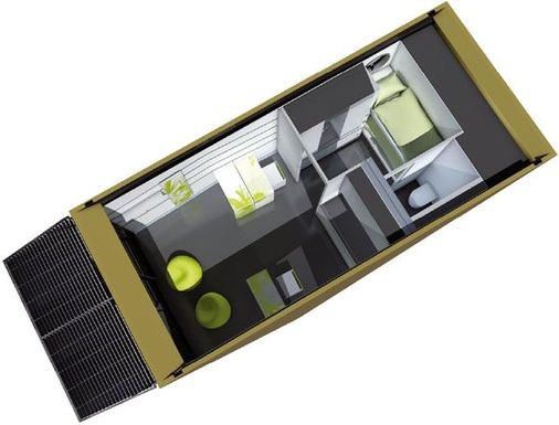 Auf einsame Inseln ist der Einsatz von Self natürlich nicht beschränkt, frische Almwiesen oder das Dach eines Hochhauses sind als Standorte ebenso denkbar. Hauptsache, der Container steht nicht im Schatten. Denn die in Dach und Vordach integrierte Photovoltaikanlage, entwickelt von der Schweizer Solventure GmbH, ist Herzstück der Energieversorgung. Eingesetzt werden Sunpower-Siliziumzellen mit 23 Prozent Wirkungsgrad, laminiert in Glas-Glas-Modulen der Firma Ertex. Die 3,75-Kilowatt-Anlage soll nicht nur Strom für Licht und alle elektrischen Geräte im Container liefern, sondern auch Heizung und Lüftung unterstützen – immerhin kann sie selbst in der Schweiz eine beachtliche Strommenge erzeugen, laut EMPA beispielsweise 4.375 Kilowattstunden in Zürich oder 5.285 Kilowattstunden in Davos.