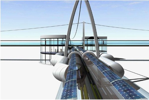Dann fließt die Kapsel weiter, gezogen und gedrückt von Luft. Vor ihr saugt ein Unterdruck, hinter ihr presst der Überdruck. Der muss von Kompressoren erzeugt werden, die alle ein bis acht Kilometer aufgestellt werden und über Solarzellen mit Strom versorgt werden sollen. Die Zellen sollen ihren Platz auf den Röhren finden – das System würde damit seinen Verbrauch vor Ort selbst erzeugen.