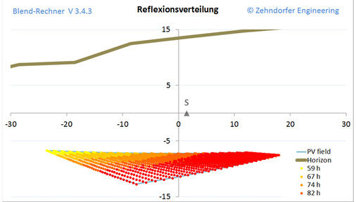 Eine neue Methode der Blendberechnung der österreichischen Firma Zehndorfer Engineering Consulting erlaubt die detaillierte Simulation von Reflexionen im dreidimensionalen Raum. Einzigartig ist dabei, dass nicht nur die direkten Spiegelungen der Sonnenstrahlen, sondern auch Streuungen des Lichts berücksichtigt werden. Module und solarthermische Paneele haben oft raue, strukturierte Oberflächen, damit sie mehr Licht absorbieren. Diese führen jedoch auch dazu, dass das Sonnenlicht in unterschiedliche Richtungen gestreut wird.