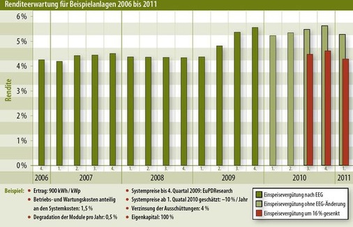 Ein Problem besteht in der begrenzten Aussagekraft der Renditerechnungen. Durch einige Annahmen lässt sich eine Rendite berechnen, die um einige Prozent höher oder niedriger liegt. In die Rechnung geht etwa die Schätzung ein, dass die Systemkosten, ausgehend von 3.255 Euro Ende 2009, das ist das Ergebnis einer Umfrage von EuPD Research unter Handwerkern, im Laufe des Jahres um zehn Prozent fallen und im ersten Quartal bei 3.180 Euro liegen. Allerdings zeigt eine genauere Kostenaufstellung, dass auch jetzt schon unter bestimmten Bedingungen Anlagen für 2.900 Euro pro Kilowattpeak machbar sind, wodurch die Rendite um 0,5 Prozent höher liegen würde.