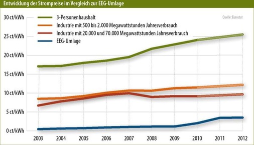 Die Frontlinien verlaufen sogar quer durch die Regierung, wie die Äußerungen von Umweltminister Norbert Röttgen von der CDU und seinem FDP-Wirtschaftskollegen Philipp Rösler zeigen. Der Brüderle-Nachfolger erkennt zwar an, dass es sich in diesem Jahr um eine moderate Steigerung handelt, doch sein Fokus ist auf die künftige Entwicklung gerichtet. Röslers Credo lautet mit Blick auf die Strompreise für Unternehmen und Haushalte: „Weitere Steigerungen müssen vermieden werden.“ Auf Nachfrage verweist das Ministerium auf eine Erklärung der Bundesregierung vom Juni, in der steht: „Es gilt, bestehende Kostensenkungspotenziale auszuschöpfen, so dass die Größenordnung der EEG-Umlage von derzeit3,5 Cent je Kilowattstunde nicht überschritten wird.“ Daher wolle das Wirtschaftsministerium die Entwicklung der EEG-Umlage „sehr genau“ beobachten. Außer Acht gelassen wird dabei, dass einzig die Stromtarife für die privaten Haushalte in den vergangenen Jahren konstant gestiegen sind, während die Kosten für die Industrie weitgehend stabil blieben (siehe Grafik Seite 18).