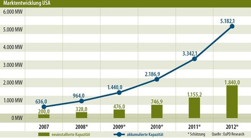 Am deutlichsten wird der Fortschritt in den letzten Monaten, wenn man die alte Prognose vom EuPD vor der Bailout Bill mit der Prognose danach vergleicht: Bereits 2009 sollen ganze 19 Prozent mehr installiert werden, als ursprünglich angenommen; „die neue Förderpolitik wird viele Projekte, die auf Eis liegen, wieder in Schwung bringen“, formuliert es der EuPD-Bericht. Doch erst danach schlage sich die neue Politik richtig nieder. So könnten alleine im Jahr 2012 60 Prozent mehr installiert werden als im September angenommen.