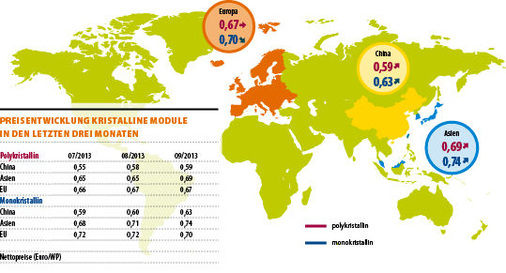 Der Preisanstieg auf dem restlichen asiatischen Sektor fällt diesmal deutlicher aus. Polykristalline Module gehen um vier Cent nach oben, monokristalline haben zwei Cent zugelegt. Dies liegt unter anderem an der wachsenden Nachfrage im asiatischen Binnenmarkt. So hat Japan zum ersten Mal im September einen Importüberschuss bei Modulen verzeichnet. Damit sinkt die Notwendigkeit, zu exportieren, was sich in der Preisgestaltung deutlich niederschlägt.
