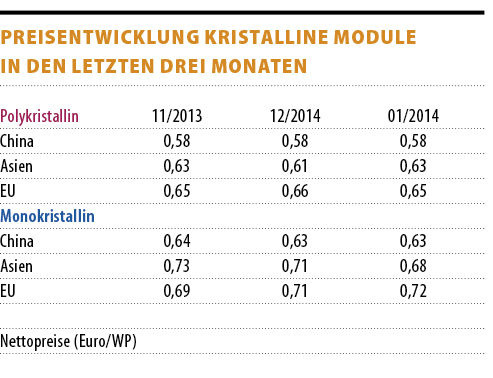 Die Preisentwicklung kristalliner Module brachte im Januar nur wenig Veränderungen. Chinesische polykristalline Module liegen weiterhin auf konstanten 0,58 Euro. Ebenso unverändert ist die Situation bei den monokristallinen Modulen, die weiterhin im Mittel 0,63 Euro kosten.