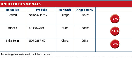 Eine Preissenkung um einen Eurocent ergab sich bei den asiatischen polykristallinen Modulen. Sie liegen nun bei 0,52 Euro pro Watt. Gerade bei größeren Mengen für Projekte spielen die Asiaten den Preisvorteil gekonnt aus. Ab einer gewissen Größe sind Preise deutlich unter 50 Eurocent möglich. Die monokristallinen Module aus Asien sind noch deutlicher gesunken, von 0,60 Euro auf 0,57 Euro. Um einen Cent von 0,59 Euro auf 0,58 Euro haben sich polykristalline Module aus Europa nach unten bewegt. Monokristalline Module sind noch deutlicher gefallen – von 0,72 auf 0,68 Euro.
