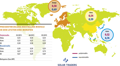 Im Mai ergaben sich nur kleine und unspektakuläre Preisanpassungen. Der neue Mindestimportpreis für polykristalline Module aus China von 0,56 Euro ist noch nicht vollends im Markt angekommen. Somit steht der Preis für polykristalline Module noch bei 0,54 Euro, was sich durch Bestandsware erklären lässt. Importe nach dem 1. April 2015 werden dann voraussichtlich bei 0,57 bis 0,59 Euro liegen. Eine Preiserhöhung in diesem Segment ist also zu erwarten. Die monokristallinen Module zeigen sich unverändert und werden im Schnitt bei 0,59 Euro gehandelt. Die Asiaten konnten im Bereich der polykristallinen Module abermals ihre Vormachtstellung als günstigste Herstellerregion behaupten. Von 0,53 auf 0,52 Euro sank der Index in den letzten vier Wochen. Bei den monokristallinen Modulen hingegen stieg der gemittelte Preis von 0,72 auf 0,74 Euro.