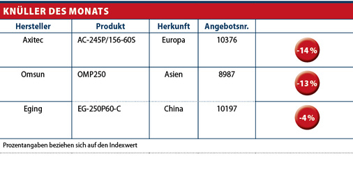 Bei den Asiaten ergeben sich erklärungsbedürftige Preissprünge im Bereich monokristalliner Module. Ganze zehn Cent ist der Index angestiegen. Wie aber so oft in diesem Segment ist hier die Zusammensetzung des Portfolios Auslöser des Anstiegs. Hochpreisige Hersteller wie Ben-Q haben den Index anziehen lassen. Die günstigen Anbieter wie Sunrise, QXPV oder Omsun haben den Wechselkurs zwischen Dollar und Euro antizipiert und ihre Preise ebenfalls um etwa zwei bis drei Cent angehoben. Diese Module werden aber immer noch unter 50 Cent pro Watt gehandelt. Polykristalline Module aus dem Raum Asien sind um einen Cent im Durchschnitt gestiegen und liegen im Großhandel bei 0,53 Euro pro Watt.
