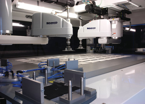 Schmid präsentiert auf der Intersolar in München drei Systeme zur Produktion kristalliner Solarmodule. Der Wafer Singulation WS2000 vereinzelt dünne Wafer im Wasserbad, nachdem sie bereits im vorhergehenden Arbeitsschritt gesägt wurden. Je nach Waferstärke schafft die Maschine einen Durchsatz von bis zu 2000 Wafer pro Stunde. Waferbruch wird automatisch erkannt und aussortiert.