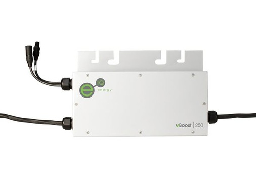 Gleichzeitig vermeidet eIQ die Nachteile der Parallelverschaltung, in dem es jedes Modul mit einem DC-DC-Steller namens vBoost ausstattet. Der vBoost enthält am Eingang einen MPP-Tracker und betreibt so das angeschlossene Modul mit der Spannung, bei der es die maximale Leistung liefert. Am Ausgang setzt vBoost die Spannung auf 250 oder 350 Volt Gleichspannung hoch. Da alle vBoos die gleiche Ausgangsspannung liefern, können die damit ausgestatten Module parallel verschaltet werden. Durch die relativ hohe Spannung können die Kabel dünner als sonst in parallelverschalteten Anlagen gehalten werden.