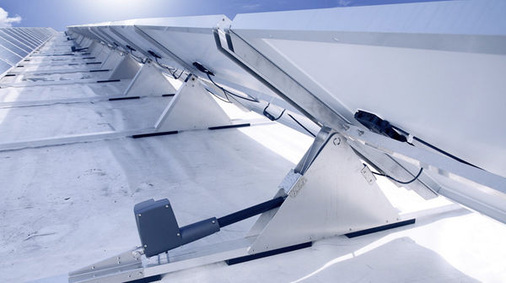 Das Unternehmen Geckovoltaik zeigt das einachsige Trackingsystem Ilioflex. Da es ein geringes Flächengewicht von unter zehn Kilogramm pro Quadratmeter habe, eigne es sich für Industrieflachdächer, deren Statik für ein Nachführsystem bisher nicht ausreichte. Über eine astronomische Steuerung stelle sich das System exakt auf den optimalen Winkel zur Sonne ein. Zwei Sensoren an den Außenkanten des Modulfeldes sorgen dafür, dass beim sogenannten Backtracking keine dahinterliegenden Modulreihen verschattet werden. Das System wird von einem Linearmotor angetrieben und ist laut Hersteller für eine Lebensdauer von mehr als 30 Jahren konzipiert. Es sei durch seine steife Aluminium-Unterkonstruktion sehr stabil und für alle Modularten geeignet.