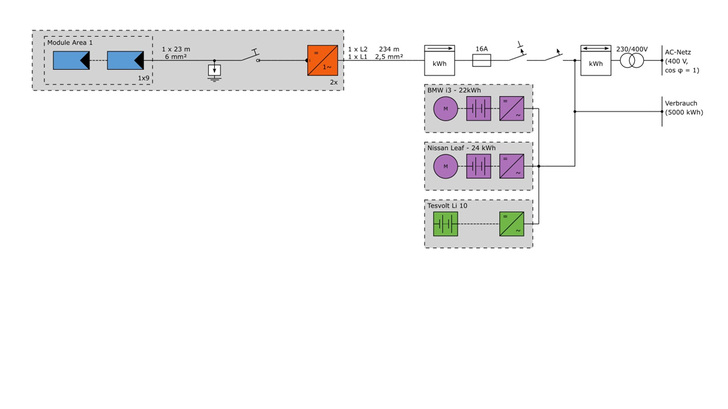 Dies betrifft die Übernahme sowie Eingabe von geometrischen Daten zur Darstellung eines 3DModells als Grundlage zur Positionierung der Module und die Aufnahme von komplexen Parametern zur detaillierten technischen Nachbildung des gesamten Systems. Zur Nachbildung der Verbraucher gehört nun auch die detaillierte Eingabe von E-Fahrzeugen, die in mehrere Gruppen aufgeteilt werden können (Schaltplan siehr Grafik). Für jede Gruppe können dabei der Fahrzeugtyp, die Anzahl und die zu erwartenden Fahrkilometer festgelegt werden. Die Zeiten an der Ladestation können für jede Gruppe an den sieben Wochentagen unterschiedlich eingestellt werden.