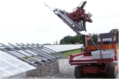 Die Entwickler haben dazu erstens einen Transportbehälter gebaut, mit dem die Module eng verpackt und zur Baustelle gekarrt werden können. Zweitens haben sie einen halbautomatischen Montageroboter entworfen, der die Module mit sechs Saugnäpfen aufnimmt und auf das Gestell setzt. Drittens gehört zu der Gehrlicher-Lösung ein Montagesystem, mit dem es nach Angaben der Firma möglich ist, die 5,6-Quadratmeter-Module in nur 60 Sekunden vom Lkw zu nehmen und zu installieren (siehe photovoltaik03/2010, Seite 78). Geschäftsführer Klaus Gehrlicher freut sich und ist überrascht. Denn eigentlich habe ein Roboter ja „weniger Sex-Appeal als eine Zelle“. Das System füllt in der Tat eine Lücke, die vielen Firmen schwer zu schaffen macht, die diese 5,6 Quadratmeter großen Dünnschichtmodule mit Maschinen von Applied Materials herstellen.
