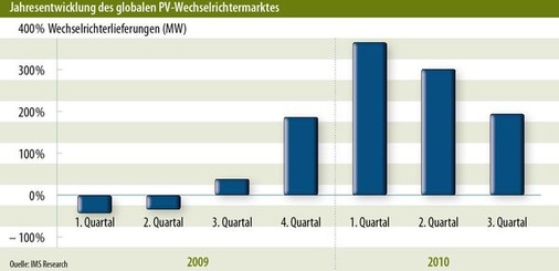 Allerdings könnte diese enthusiastische Stimmung ein Überangebot an Wechselrichtern zur Folge haben. Im November warnte IMS Research davor, dass die weltweite Herstellungskapazität von 30 Gigawatt im vierten Quartal 2010 den Bedarf um zwei Gigawatt überschreiten könnte. Wenn alle Hersteller ihre Erweiterungspläne umsetzen, könnte die Gesamtkapazität 2011 um weitere 40 Prozent ansteigen. Das Marktforschungsunternehmen hat festgestellt, dass im ersten Halbjahr 2010 „vielfach Doppelbestellungen“ getätigt wurden. Damals wurde beispielsweise in Deutschland eine unglaubliche Anzahl an Neuanlagen installiert, und die Käufer wollten sicherstellen, genügend Wechselrichter zur Verfügung zu haben. Allerdings wird die Nachfrage in Deutschland wahrscheinlich zurückgehen, so dass die Wechselrichterlagerbestände steigen und die Gewinne der Hersteller sinken werden.