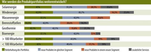 Die gesamte Erneuerbare-Energien-Branche setzt auf Innovation. 57 Prozent wollen zusätzliche Marktanteile durch die Entwicklung neuer Produkte und Dienstleistungen gewinnen. Ein Fünftel will in neue Bereiche und zusätzliche Serviceangebote expandieren.