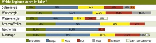 Deutschland und Europa sind für die Solarunternehmen ebenso wie für die gesamte Branche derzeit die wichtigsten Absatzmärkte. Bei der europäischen Präsenz hinken die Solarfirmen allerdings der Windbranche und den Brennstoffzellenherstellern deutlich hinterher. Letztere sind jetzt schon am stärksten global ausgerichtet. Auch Asien haben deutsche Solarunternehmen derzeit noch weniger im Fokus als beispielsweise Windkraft-Firmen. Dafür ist die deutsche Solarbranche auf dem US-Markt besonders aktiv, jedes dritte Unternehmen ist hier vertreten. Auch in Afrika und Australien sind die Solarunternehmen aus Deutschland – neben den Brennstoffzellenherstellern – stärker präsent als der Rest der Branche.
