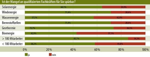 Hauptbremsklotz für das Wachstum der Cleantech-Firmen ist der Fachkräftemangel. 64 Prozent der Solarunternehmen sehen dies als Problem. Dabei ist die Situation bei größeren Unternehmen mit über 100 Mitarbeitern besonders angespannt. Vor allem in der Forschung und Entwicklung (63 Prozent), dem Produktmanagement, Service und Kundenberatung (31 Prozent) sowie der Produktion und dem produktionsnahen Service (29 Prozent) können hochqualifizierte Stellen nicht besetzt werden. Gesucht werden vor allem Ingenieure. Dies wirkt sich für viele Unternehmen unmittelbar auf das Geschäftsergebnis aus: Potentiale im Vertrieb werden nicht ausgeschöpft, Aufträge können nur stockend abgewickelt werden, Innovationen werden gehemmt und Kundenaufträge müssen abgelehnt werden.