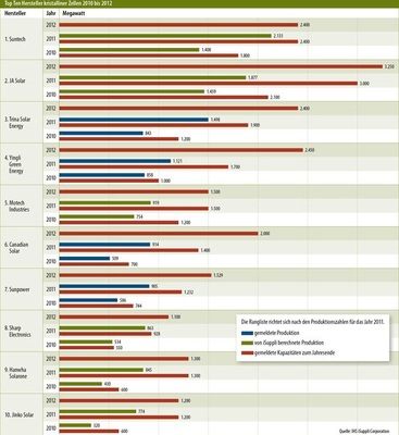 Der chinesische Hersteller Canadian Solar hat seine Zellproduktion 2011 im Vergleich zum Vorjahr fast verdoppelt und baut die Kapazitäten 2012 weiter aus. Im Jahr 2011 auf Platz sechs, war der integrierte chinesische Hersteller 2010 noch nicht einmal unter den Top Ten. „Sie haben aggressive Expansionspläne im Bereich der Zellen und Module“, sagt de Haan. „Die Produktion in einem stagnierenden Markt derart zu erweitern, das wird schwer werden.“ Canadian Solar produziert seine Zellen vor allem für die eigene Modulproduktion.