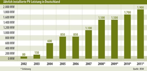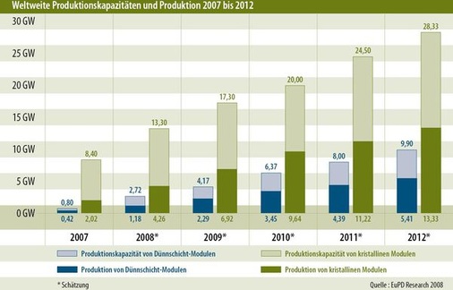 Doch auch die deutschen Hersteller reagieren: Branchenintern gebe es längst Verhandlungen über Preissenkungen, die deutlich über der neuen Degressionsrate von bis zu zehn Prozent des EEG liegen, sagt Stephan Orthen von Eclareon. Markus Hoehner von EuPD Research prognostiziert aufgrund einer Modulschwemme starke Preiseinbrüche noch im ersten Quartal. Die ehrgeizigen Ausbaupläne der Industrie haben in den letzten drei Jahren weltweit zu einer Verdreifachung der Produktionskapazitäten geführt. Doch damit nicht genug: Der BSW-Solar prognostiziert laut Carsten Körnig, dass alleine die deutschen Modulbauer ihre Produktion bis 2010 auf 2,5 Gigawatt nochmals verdoppeln werden.Schritt für Schritt klaffe „eine Schere zwischen Angebot und Nachfrage“, sagt Bankanalyst Fawer, die so schnell nicht durch neue Märkte zu schließen sei. Verschärft durch die Finanzkrise, fehlt es momentan an neuen Boom-Märkten, auf denen die Überproduktion platziert werden kann. Markus Hoehner kann für 2009 auch nur „zwei große relevante Nachfragemärkte“ erkennen: Italien und die USA. Beide bleiben bei einem geschätzten Niveau an Neuinstallationen von 250 bis 500 Megawatt stecken und sind zu klein, um einsteigendes Angebot aufzufangen. Für Eclareon-Berater Orthen sind die USA auch mit den 150 Milliarden US-Dollar aus den Regierungskassen des neuen Präsidenten Barack Obama „frühestens ab 2010 ein interessanter Exportmarkt“. Aktuell bietet immer noch Deutschland mit seiner garantierten EEG-Förderung die besten Aussichten. „Vor allem die zweite und dritte Garde der ostasiatischen Hersteller wird gezwungen sein, etwaige Lagerüberhänge möglichst schnell zu veräußern“, prognostiziert Hoehner. Dadurch entsteht ein zusätzlicher Preisdruck aus dem Ausland, der für deutsche Hersteller noch zu den „systemimmanenten acht bis zehn Prozent“ aufgrund der höheren Degression im EEG hinzukommt. Sein Marktforschungsinstitut hält deshalb über das Jahr gerechnet sogar Preissenkungen zwischen 15 und 20 Prozent für denkbar – wenn auch nicht für jedes Modul oder System. Von Szenarien mit sinkendem Marktwachstum und stark fallenden Preisen wollen Unternehmer nach dem Blütejahr 2008, mit Umsatzsprüngen bis weit über 100 Prozent, nichts wissen. Andreas Hänel, Vorstandsvorsitzender des Photovoltaik-Systemhauses Phoenix Solar AG, hält solche Prognosen „für übertrieben“. Realistisch sei eine Absenkung im Rahmen der Degressionssätze des EEG. „Wenn im Falle einer Überversorgung im nächsten Jahr die Preise noch stärker zurückgehen“, so Hänel, „macht das die Rendite für Kunden und eine Investition in Photovoltaik nur attraktiver – die Basis für ein mögliches Marktwachstum in Deutschland.“ Ein „klares Überangebot“ habe es auch schon mal im Jahr 2003 gegeben, das sei ein „ganz normaler Zyklus“. Auch Carsten Körnig vom BSW-Solar sieht als „Messlatte für die Preissenkung“ die acht bis zehn Prozent Vergütungsrückgang. Schließlich seien die Systempreise in zweiAuch in Deutschland wird laut BSW die Produktion von Solartechnik stark ausgebaut.Jahren schon um 15 Prozent gesunken. Weitere Preissenkungen seien höchstens durch „weitere Kostenreduktion aufgrund der beschleunigten Automatisierung der Produktionsprozesse“ zu erwarten. Wenn überhaupt ein Beteiligter die Preise senken soll, dann ist es die Industrie, denn der Großhandel winkt erschrocken ab. Jochen Schnabel von Frankensolar sieht zwar Potenzial für Preissenkungen, die „ein bisschen über dem Durchschnitt liegen – aber vom Großhandel können sie diesmal nicht kommen“.