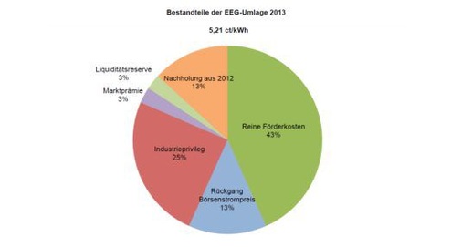 Die wahren Ursachen für den erwarteten drastischen Anstieg der EEG-Umlage liegen aber vor allem in der ausgeweiteten Industrieförderung, den sinkenden Strompreisen an der Strombörse sowie dem nachträglichen Ausgleich für die geringeren Einnahmen im laufenden Jahr, wie es beim BEE heißt. Allein auf die Industrieförderung entfalle nach BEE-Berechnungen ein Anteil von 1,3 Cent pro Kilowattstunde - immerhin ein Viertel des Gesamtbetrages 2013 und rund 0,3 Cent mehr als in diesem Jahr. "Wenn die Bundesregierung eine Industrieförderung in dieser Größenordnung für notwendig hält, muss sie dafür andere Instrumente wählen als ausgerechnet die Stromrechnung der Verbraucher", sagte Uphoff dazu. Dafür seien zum Beispiel entsprechende steuerliche Regelungen denkbar. Der sinkende Börsenstrompreis und der Nachholeffekte wirkten sich mit jeweils 0,7 Cent je Kilowattstunde auf die EEG-Umlage 2013 aus. Hinzu kämen noch etwa 0,3 Cent je Kilowattstunde für die Kosten der Marktprämie und des Liquiditätspuffers.