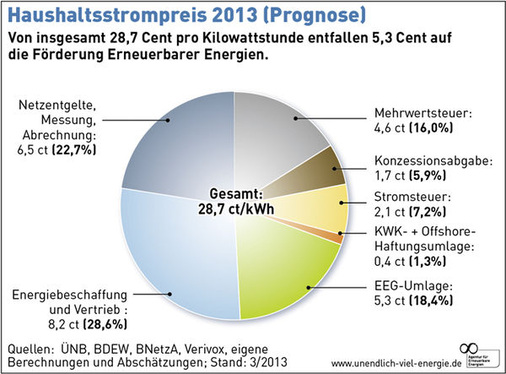 Im Jahr 2014 bezahlen die nicht privilegierten Stromverbraucher 6,24 Cent pro Kilowattstunde für die Förderung regenerativen Stroms. Für 2015 prognostizieren die Übertragungsnetzbetreiber (ÜNB) eine Senkung dieser Umlage. Die erneuerbaren Energien sind längst nicht mehr der Kostentreiber. Anders als die Netze. Eine aktuelle Analyse der 26 größten Verteilnetzbetreiber durch den Hamburger Stromversorger Lichtblick zeigt, dass die privaten Stromkunden im kommenden Jahr zwischen 6,5 und 6,9 Cent pro Kilowattstunde bezahlen – mehr als durch die EEG-Umlage. Die Netzentgelte steigen dabei mit zunehmendem Ausbau. Der ist wiederum notwendig. Denn in den vergangenen Jahren haben die Netzbetreiber zu wenig in die Infrastruktur investiert. Das bedeutet aber: Die Netzentgelte steigen, je mehr die Betreiber investieren. Denn neben Systemdienstleistungen zur Sicherung der Stabilität des Netzes, neben der Deckung der Netzverluste, der Förderung von Energie aus Kraft-Wärme-Kopplung, dem eventuellen Vorhalten von Reservekapazitäten, der Messung und Abrechnung des Verbrauchs, neben der Konzessionsabgabe und der Umsatzsteuer zahlen die Verbraucher vor allem für die Nutzung der Netzinfrastruktur. Ein erheblicher Teil davon ist wiederum für den Bau und die Instandhaltung der Leitungen vorgesehen. Dazu kommen noch weitere Sonderabgaben zur Finanzierung des Netzes. Die sogenannte Offshore-Haftungsumlage – die Haftpflichtversicherung für die Stromleitungen zu den Windkraftanlagen in der Nord- und Ostsee – schlägt seit Anfang 2013 mit jährlich 0,25 Cent pro Kilowattstunde zu Buche. Mit der „Sonderkundenumlage“ zahlen Haushalte und Mittelstand für die Entlastung der Industrie bei den Netzentgelten. Immerhin sinkt diese Abgabe 2014 von bisher 0,329 Cent auf 0,092 Cent pro Kilowattstunde. Grund dafür ist eine von Gerichten erzwungene Rückerstattung bisher überzogener Befreiungen der Industrie von den Netzentgelten, die mit der Umlage 2014 verrechnet wird.