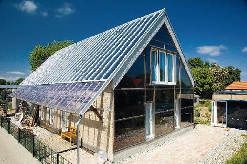 Neuland betrat Naumann mit der Nutzung von Solarstrom. Studenten installierten eine Photovoltaikanlage mit einer Spitzenleistung von 3,7 Kilowatt auf der südwestlichen Dachfläche. Sie verbauten 70 Quadratmeter Dünnschichtfolien von Uni-Solar, die auf Blechen montiert angeliefert wurden, als Dachhaut einer Kaltdachkonstruktion. Denn Naumann hatte der Anlage noch eine weitere Funktion zugedacht. „Wir wollten uns die aufwändige Verlegung von Erdsonden für die Vortemperierung der Frischluft sparen“, erläutert der Konstrukteur. Also suchte er nach einer anderen Lösung für die Luftvorwärmung. Und wurde unterhalb der photovoltaischen Dachhaut fündig. Die warme Luft, die unter den mit Photovoltaikfolien belegten Metallbahnen entsteht, heizt nun die Frischluft für das Gebäude vor. Die Wärme wird mithilfe kleiner Computergebläse in das Lüftungssystem gebracht. Der Tüftler sucht aber noch eine leisere Lösung.