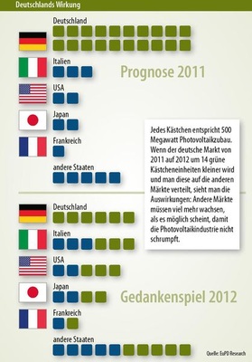Geht man von einem Zubau von 9,8 Gigawatt in Deutschland für 2011 und lediglich drei Gigawatt für 2012 aus, so müssten die verbliebenen Märkte eine Lücke von annähernd sieben Gigawatt schließen. Gelingt dies, wäre damit immer noch kein Marktwachstum erreicht, sondern lediglich eine Stagnation – die erste in der Geschichte der Photovoltaik. Aus derzeitiger Sicht erscheint aber selbst dieses Nullwachstum noch als optimistisches Szenario. Um den Marktrückgang von sieben Gigawatt in Deutschland zu kompensieren, müssten wichtige Märkte wie Italien, Japan, Frankreich und die USA zwischen 2010 und 2012 um 100 oder 150 Prozent wachsen. Im gleichen Zeitraum müssten auch alle restlichen Märkte weltweit ihren Zubau verdoppeln und 2012 ein Gesamtvolumen von rund fünf Gigawatt aufnehmen. „So ein Szenario ist ein Gedankenspiel, zeigt aber, wie sehr der weltweite Photovoltaikmarkt verzahnt ist und wie stark auch ausländische Märkte von den Entwicklungen in Deutschland abhängen“, erklärt EuPD-Experte Jan Winkler.