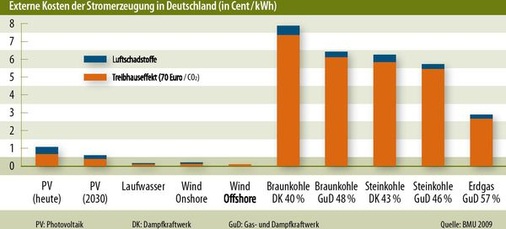 Die Förderung der Photovoltaik über das EEG kostet Milliarden. Dies ist jedoch eine zeitlich befristete degressive Anschubfinanzierung, die vor allem mittel- und langfristig volkswirtschaftliche Vorteile bringt. Zudem kalkuliert das RWI mit einer zu niedrigen Preissteigerung für fossile Energien. Im nächsten Jahrzehnt ist laut dem Deutschen Institut für Wirtschaftsforschung (DIW) damit zu rechnen, dass sich die Rohölpreisevon derzeit knapp 80 US-Dollar auf 200 US-Dollar pro Barrel mehr als verdoppeln. Entsprechend schneller wird Solarstrom konkurrenzfähig sein. Zudem rechnet das RWI durchweg mit den höchsten Vergütungssätzen für Dachanlagen. Das DIW veranschlagt die Kosten der Solarstromförderung über das EEG mit rund 55 Milliarden Euro bis zum Jahr 2030 deutlich niedriger als das RWI. Auch das sogenannte Leitszenario des BMU von 2008 kommt zu dem Fazit, dass die Differenzkosten (Mehrkosten) für den Ausbau der regenerativen Energien in Deutschland bis 2013 weiter ansteigen und danach deutlich sinken werden. Das DIW weist darauf hin, dass die Mehrkosten der Photovoltaikförderung in 2008 mit rundzwei Milliarden Euro pro Jahr unter den jährlichen Beihilfen für die Steinkohle von 2,2 Milliarden Euro liegen, die sich in den kommenden Jahren auf weitere 20 Milliarden Euro belaufen werden. Mit 260 Milliarden Euro wurde und wird laut einer Greenpeace Studie die Atomkraft hierzulande gefördert.
