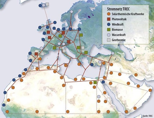 Dieser Überfluss ist selbst Frankreichs Präsidenten und Atomkraftbefürworter Nicolas Sarkozy nicht entgangen. Denn einer der Schlüsselbereiche der von ihm im vergangenen Jahr ausgerufenen Mittelmeerunion ist die Initiative für einen mediterranen Solarplan. Ein Plan, der schon allein wegen seines Namens in der Photovoltaiknation Deutschland begrüßt wurde. Dabei spielt die Photovoltaik darin so gut wie keine Rolle. Stattdessen sollen in erster Linie solarthermische Kraftwerke den Sonnenreichtum Nordafrikas für Europa nutzbar machen – aus mehreren Gründen, wie die Auftaktveranstaltung der Vortragsreihe „Kraftakt: Energiemix der Zukunft“ zeigte. Auf Einladung des Innovationszentrums Energie der TU Berlin und der Technologiestiftung Berlin diskutierten Wissenschaftler Potenziale und Probleme des Wüstenstroms.„Wer Klimaschutz und nachhaltige Entwicklung will, kommt an erneuerbaren Energien nicht vorbei“, sagt Müller-Steinhagen. „Denn wer über Energieversorgung spricht, redet gleichzeitig von dem Gesicht, das unsere Erde in wenigen Jahrzehnten haben wird.“ Das DLR hat inzwischen – gemeinsam mit diversen Projektpartnern – eine ganze Reihe von Studien zur nachhaltigen Energieversorgung Europas vorgelegt und dabei auch die Möglichkeiten eines Energieverbundes zwischen Nord und Süd untersucht. Schwerpunkt bildeten die Staaten Europas (EU), des Mittleren Ostens (Middle East, ME) und Nordafrikas (NA).