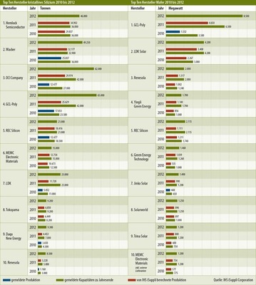 Trotz schwieriger Marktlage und massiver Überkapazitäten auf dem Siliziummarkt setzen auch die Verfolger OCI und GCL-Poly, die im Ranking auf den Plätzen drei und vier rangieren, weiterhin auf Kapazitätsausbau, um ihre Konkurrenten einzuholen. Sie hoffen, dass sich derMarkt mittelfristig wieder stabilisiert. Kurzfristige Gewinne lassen sich mit solchen Investitionen jedenfalls kaum realisieren, denn der Aufbau von Produktionskapazitäten für Silizium nimmt verhältnismäßig viel Zeit in Anspruch. „Zwischen dem Moment, in dem man die Entscheidung trifft, Kapazitäten auszubauen, und dem ersten Produktionsvolumen, das auch den Qualitätsansprüchen der Kunden genügt, vergehen mindestens 24, eher 30 Monate“, sagt Dirk Morbitzer, Managing Director bei Renewable Analytics. Das heißt, wer jetzt ausbaut, plant für eine erhöhte Nachfrage nach Silizium im Jahr 2014.