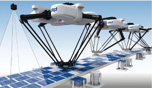 Über insgesamt vier für die Solarindustrie geeignete Robotertypen verfügt die Firma Adept. Dabei handelt es sich um Linearachs- und Sechs-Achs-Roboter, Horizontalschwenkarmroboter und Parallelkinematiken. Ein Beispiel für eine Parallelkinematik ist der „Adept Quattro“. Er verfügt über ein Vier-Arm-Design und erreicht so eine hohe Geschwindigkeit und Beschleunigung auch bei hohen Traglasten. Der Roboter wurde speziell für die High-Speed-Verpackung und das Materialhandling entwickelt. Trotz dieses vielseitigen Angebots ist das Tätigkeitsfeld der Roboter von Adept im Bereich der Solarindustrie sehr eingeschränkt: „Unsere Roboter sind vor allem dann für einen Einsatz in der Solarindustrie geeignet, wenn es um Transportaufgaben geht“, sagt Rüdiger Winter, Vertriebsleiter für Europa bei Adept.