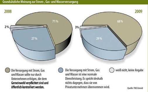Mit der Finanzkrise und ihren sozialen Auswirkungen ist der unbedingte Glaube an den Markt endgültig erschüttert worden. Kommunale Finanzakrobaten haben sich mit dem Verkauf und dem anschließenden Leasing von ehemaligem Gemeingut wie beispielsweise Straßenbahnen und Wasserwerken verzockt und zusätzlich verschuldet. Die Bürger verurteilen das, wie eine aktuelle repräsentative Umfrage im Auftrag des VKU belegt. Dazu hat das Medien- und Sozialforschungsinstitut TNS Emnid 1.000 Bürger am Telefon befragt: „Die Versorgung mit Strom, Gas und Wasser sollte nur durch Unternehmen erfolgen, die dem Gemeinwohl verpflichtet sind und öffentlich kontrolliert werden.“ Diese Aussage haben 68 Prozent der Befragten bejaht. Nur 29 Prozent der Befragten glauben dagegen, Strom, Gas und Wasser seien normale Dienstleistungen und könnten daher genauso gut von privaten Unternehmen übernommen werden.