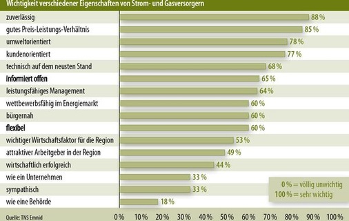 Besonders wichtig waren den Befragten eine hohe Zuverlässigkeit, ein gutes Preis-Leistungsverhältnis und die Umweltorientierung der Unternehmen, die Strom und Gas liefern. Wenn sie über einen Wechsel beim Stromanbieter nachdenken, spielen für 57 Prozent der Kunden neben dem Preis auch andere Gesichtspunkte eine Rolle. Schmerzlich hat Vattenfall das kürzlich nach den Pannen im Atomkraftwerk Krümmel erfahren müssen, als dem Energieunternehmen die Kunden scharenweise davonrannten.