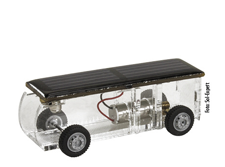 Mit den geringen Abmessungen von 60 mal 22 mal 26 Millimetern fährt der Bus gerne auch mal auf dem Küchentisch oder der Schreibtischplatte. Sein bevorzugter Asphalt liegt aber draußen in der Sonne. Und damit der Solar-Bus nicht führerlos umherirrt, wird er während der Pausenzeiten einfach aufgebockt.