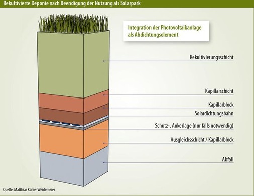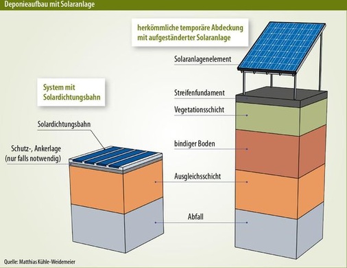 Eine völlig neue Möglichkeit, Deponieabdeckungen und Photovoltaik zusammenzubringen, hat das Ingenieurbüro Wasteconsult international von Matthias Kühle-Weidemeier entwickelt. Wenn eine Deponie geschlossen wird, liegt sie oft viele Jahre brach, um die Setzungen abzuwarten, bevor die Rekultivierungsschicht aufgebracht wird. In dieser Zeit, so Kühle-Weidemeier, könne man Deponiebahnen auflegen, in die flexible Dünnschichtmodule integriert sind. Das verringere den Eintrag von Wasser und somit die Klärungskosten, erhöhe den erfassten Ertrag an Deponiegas und produziere zusätzlich Strom. Auf der Deponie im Niedersächsischen Leppe hat er, gefördert von der Deutschen Bundesstiftung Umwelt, verschiedene Modultypen getestet, die auf Dachbahnen laminiert waren. Noch in diesem Jahr sollen dort Module installiert werden, die auf 2,5 Millimeter dicken Deponiebahnen laminiert sind. Sie sollen auch in den Handel kommen. Im Idealfall könnten diese Solardichtungsbahnen einfach liegen bleiben, wenn nach der Setzungsphase die Rekultivierungsschicht aufgebracht wird. Doch auch hier droht ein Risiko. Nur wenige Spezialbahnen sind in Deutschland für den Deponiebau zugelassen. Die Photovoltaikabdichtung gehört noch nicht dazu.