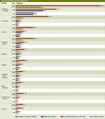 Fronius musste den Platz zwei von 2009 verlassen und nimmt jetzt den dritten Platz ein. Dabei darf nicht vergessen werden, dass auch dieser Wechselrichterhersteller seine abgesetzte Leistung im laufenden Jahr wahrscheinlich fast verdoppeln wird. Mehr als die Hälfte des Unternehmensgeschäfts und damit der Hauptteil hat mit Photovoltaik zu tun, andere Bereiche sind Schweißausrüstungen und Ladesysteme. Letzteres bietet eine gute Ausgangssituation, um Speichersysteme für den Eigenverbrauch zu entwickeln. Fronius ist auf diesem Feld bereits aktiv. „Sie haben speziell den Hausbereich in Europa und Amerika erobert“, berichtet Sheppard von iSuppli. „Wir beobachten gerade, dass momentan der Markt für große Anlagen das Geschäft dominiert.“
