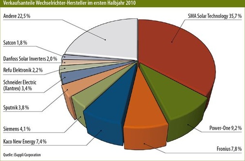 Refu Elektronik dagegen konnte seinen Marktanteil leicht steigern. Die Produktpalette reicht von Wechselrichtern für Hausdächer bis zu großen Wechselrichtern im 500-Kilowatt-Bereich. Danfoss Solar Inverters kommt wie Power-One aus dem Industrieanlagenbereich. Die Produktion ist zwar nicht so groß, hat aber eine ähnliche Dynamik. Das Unternehmen konnte seinen Marktanteil in den letzten anderthalb Jahren fast verdoppeln und wird sein Absatzvolumen in Megawatt bis zum Ende dieses Jahres gegenüber 2008 mehr als vervierfacht haben. Satcon produziert seine Wechselrichter für große Anlagen vor allem in den USA und hat sich auf Zentralwechselrichter spezialisiert. Damit hängt die weitere Entwicklung des Herstellers wesentlich von den Bedingungen bei US-amerikanischen Großprojekten ab.