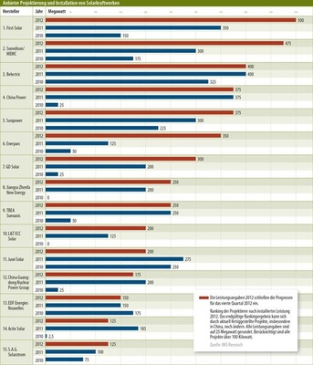 Auf den Plätzen 11 bis 15 befinden sich noch zwei deutsche Unternehmen: S.A.G Solarstrom auf Platz 15 und der Absteiger Juwi auf Platz 11. Q-Cells, im vergangenen Jahr Nummer drei, ist wie Solarhybrid, Gehrlicher Solar, Phoenix Solar, Conergy und Solon nicht mehr unter den Top 15. Bei Q-Cells könnte sich das durch den neuen Eigentümer Hanwha Solar künftig wieder ändern, glaubt Morbitzer. Aber insgesamt werden die deutschen Projektierer, wie vorher schon die hiesigen Produzenten von Solarzellen und Modulen, weiter verlieren.