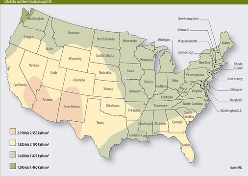 Im Gegensatz zu Wasserkraft, Wind- und Bioenergie fristet deshalb die Photovoltaik mit nur 1,5 Megawatt installierter Leistung in ganz Minnesota bisher ein Schattendasein. Dies gilt auch für andere Staaten des Mittleren Westens wie Wisconsin, Iowa oder North Dakota. An zu wenig Sonne liegt das nicht. Mit 1.460 bis 1.825 Kilowattstunden pro Quadratmeter ist die durchschnittliche jährliche Einstrahlung in den meisten Midwest-Staaten wesentlich höher als in Süddeutschland. „Doch viele Leute hier wissen das nicht, sie glauben nicht an die Sonne“, klagt Ralph Jacobsen, Chef von Innovative Power Systems (IPS). Ganze 150 Kilowatt montierten Jacobsen und seine Mannschaft im vergangenen Jahr in dem von 2,5 Millionen Menschen bewohnten Ballungsraum der Twin Cities von Minneapolis/St. Paul, dabei ist IPS der mit Abstand größte Installationsbetrieb.