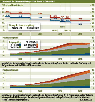 Dass man noch höhere Renditen ausrechnen kann, zeigt iSuppli. Das liegt unter anderem daran, dass in diese Rechnung eine Lebensdauer der Anlage von 25 Jahren statt von 20 Jahren eingeht und 80 Prozent der Kosten kreditfinanziert sind. Außerdem gehen die Analysten in dem Beispiel davon aus, dass 30 Prozent des Stromes selbst verbraucht werden, so dass er nach der Eigenverbrauchsregelung vorteilhafter vergütet wird als eingespeister Sonnenstrom. Da durch den Eigenverbrauch weniger Netzstrom gekauft werden muss, ist der Eigenverbrauchsvorteil umso höher, je teurer der Netzstrom ist. Die Analysten rechnen dabei mit einer Strompreisinflation von vier Prozent. Dadurch steigt der Eigenverbrauchsvorteil jedes Jahr. Das erklärt zum Teil auch, dass die Rendite von 2010 zu 2011 nach den iSuppli-Berechnungen leicht steigt, obwohl die Systemkosten mit zehn Prozent weniger sinken als die Einspeisevergütung mit 13 Prozent. Daraus folgen die hohen Zubauprognosen von iSuppli. Dass der Eigenverbrauch in der Höhe von 30 Prozent oft ohne viele zusätzliche Maßnahmen machbar ist, macht das Szenario plausibel, je nach Erwartung an den Strompreis.