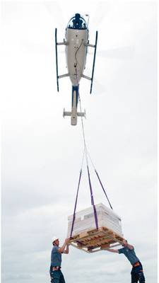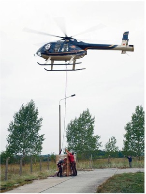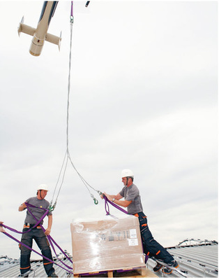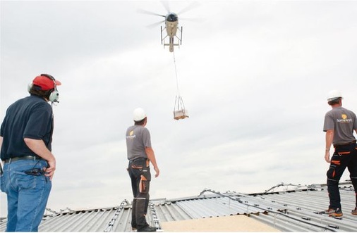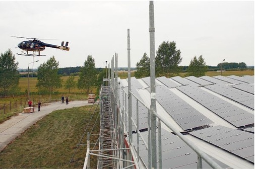 Beim ersten Mal kam er nicht hoch, der Hubschrauber vom Typ McDonnell- Douglas 600 N, der in zwei Tagen 200 Paletten mit je 50 Solarmodulen aufs Dach fliegen sollte – pro Palette fast 800 Kilo. Der Auftraggeber hatte bei der Angabe der Last vergessen, das Gewicht der Paletten mitzurechnen. Pilot Knut Wagner, Inhaber des Unternehmens Sky Heli, warf kurzerhand Ballast ab, enttankte, nahm die Beifahrersitze raus. Danach lief alles wie am Schnürchen. Wagner kreiste im Zwei-Minuten-Takt zwischen Modullager und Dach.