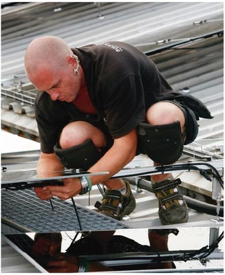 Während das Sonnenkraft-Team die per Hubschrauber angeflogenen Module auf dem Süddach montiert, installieren die Handwerker der Solar Gruppe Nord auf dem Norddach ein Modul nach dem anderen zu lauter Diskomusik. Die meisten Mitarbeiter kommen aus Rostock, einige sind selbständig und arbeiten in einem längeren Turnus mit verlängertem Wochenende. Wenn es regnet, müssen sie Pause machen, dann wird es auf dem Aluminiumdach glitschig.