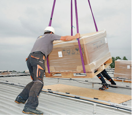 Der zweitägige Hubschraubereinsatz kostet laut Sky Heli 16.000 Euro brutto und ist damit billiger und effizienter als ein Kran, der immer wieder umgestellt werden muss. Jürgen Baum, Projektleiter bei Colexon, hat vor allem die Zeitersparnis im Blick: „Mit dem Hubschrauber“, sagt er, „können die Module am einfachsten und schnellsten auf die riesige Dachfläche transportiert werden.“ Um die Dachanlage möglichst schnell fertigzustellen, hat die Projektiergesellschaft Colexon zwei Unternehmen mit der Montage der Solarpanels beauftragt, so dass 40 Mann gleichzeitig auf dem Dach arbeiten können: Sonnenkraft aus Dorsten in Nordrhein-Westfalen und die Solar Gruppe Nord S.G.N. GmbH aus Admannshagen, Mecklenburg-Vorpommern. Die Verkabelung übernimmt die Firma Elektro-Service Lothar Haupt aus Audenhain in Sachsen.