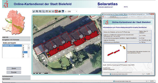 Auf den Internetseiten der Städte Wiesbaden, Bielefeld und Freiburg ist das Solardachkataster ein Renner, was die virtuellen Besucherzahlen anbelangt. „Das ist die am meisten angeklickte Seite auf Bielefeld.de“, sagt Björn Klaus vom Bielefelder Umweltamt. „2.000 bis 4.000 Klicks landen im Monat auf der Zielseite.“ Viele andere Städte und Gemeinden sind bereits ebenfalls solar online. Oft kann man nicht nur sehen, ob eine Dachfläche geeignet ist oder nicht. Die Programme geben auch gleich an, wie viel Kohlendioxidausstoß man vermeiden kann.