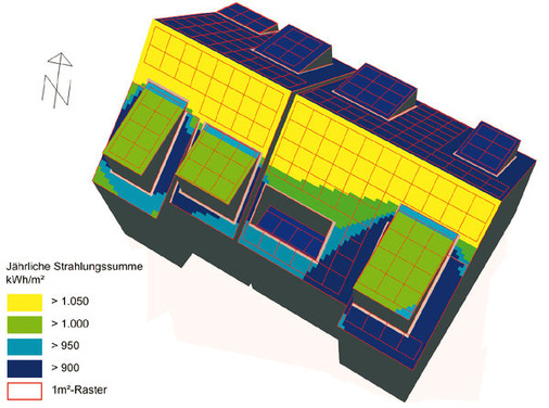 An dieser Stelle setzt Aerowest mit einem zusätzlichen Service an: der detaillierten Einzeldachanalyse. Für 150 Euro vermisst die Firma das Dach aus vorhandenen Daten in einer räumlichen Auflösung von 20 mal 20 Zentimeter und den Strahlungsverlauf mit einer zeitlichen Auflösung von zwei Minuten. Dabei berücksichtigt die Firma dann auch Gauben, Schornsteine und Dachfenster.