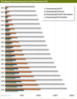 Auf dieser Basis ermittelt er vier Varianten für die Stromrechnung, wobei er einen jährlichen Strompreisanstieg von vier Prozent zugrunde legt. Zunächst errechnet er die Stromrechnung ohne Photovoltaikanlage, anschließend die Stromrechnung mit Anlage, aber ohne Eigenverbrauch. In diesem Fall werden die Einnahmen durch die Einspeisevergütung abgezogen, da sie die Stromkosten reduzieren. Im dritten Schritt ermittelt er die Stromrechnung für den Fall, dass der Haushalt eine Solaranlage ohne Speichersystem hat, im letzten Schritt dann für eine Anlage mit Speicher. Schritt für Schritt sinken die Kosten für die Stromrechnung.