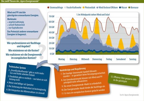 Das Ziel ist klar. Die Energiewende ist beschlossen, und niemand zweifelt ernsthaft an ihrem Sinn. Die Diskussionen und Widerstände fangen da an, wo es um die Machbarkeit geht, um die Kosten und um handfeste wirtschaftliche Interessen einzelner Gruppen. Deshalb steht nicht das Ob, sondern das Wie im Mittelpunkt der Arbeit. Dazu hat das Agora-Team zwölf Thesen erarbeitet. Diese sollen nun breit diskutiert werden von all denen, die an der Energiewende beteiligt sind. Die Hauptthese lautet: „Im Mittelpunkt stehen Wind und Solar.“ In den weiteren Thesen wird dann ausgeführt, in welche Richtung sich das Energiesystem und der Energiemarkt verändern müssen.